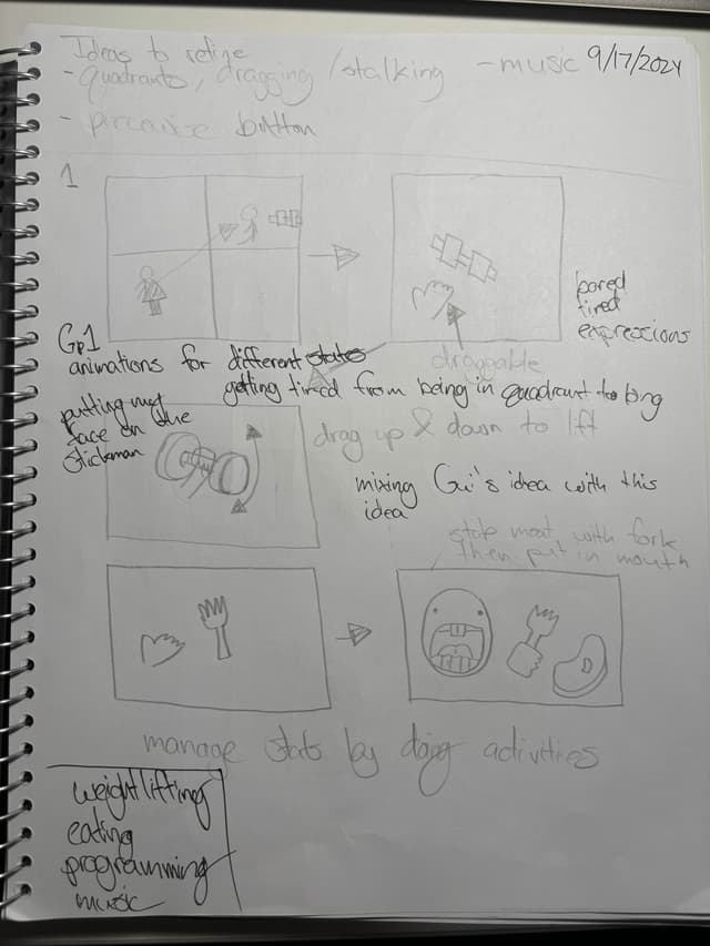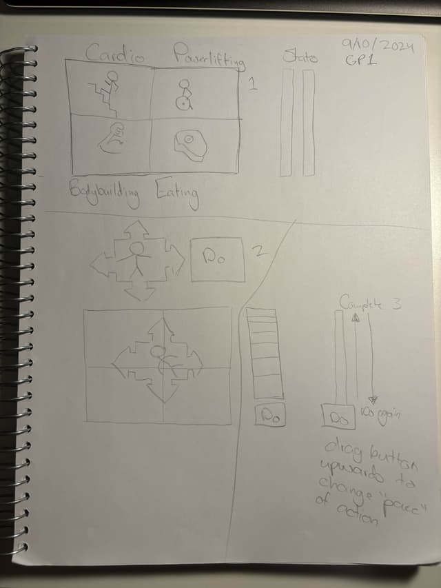 - A scraped idea where the button could be dragged up and down to do the action. All the way up and all the way down would be a complete repetition of an action. This was heavily tied to the idea of exercise.