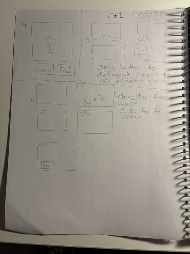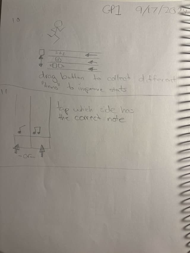 - Another music related idea, however with a more Guitar Hero-like approach. The draggable button here would allow you to collect certain powerups that would cause the character to progress through the day correctly. The character's state would change overtime, and more rapidly if properly chosen powerups were caught by the draggable button.