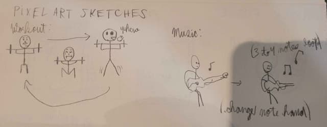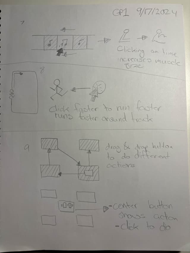 - For this design, the user could see an incoming stream of notes to press. If the correct note was pressed on time the character would workout harder and the muscle size would increase.