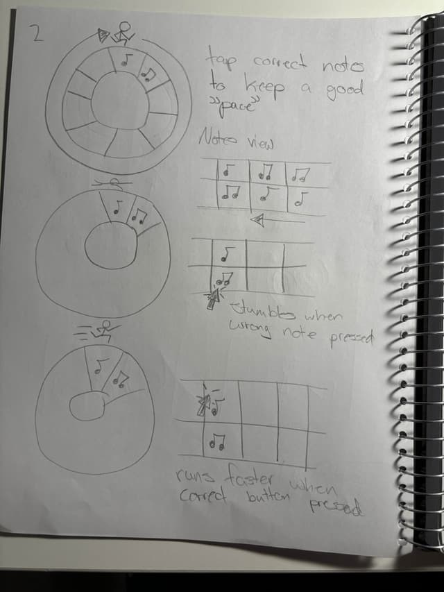 For this idea, the character would run on top of spinning circle that contained notes. These notes would be replaced with a different note after the user tapped one of the buttons.