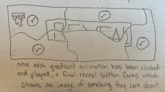 This is one of Alex's sketches. It showcases a piecewise button which was another one of the ideas we heavily considered. Essentially, each quadrant represents one of the actions and when the animation was completed another piece of the piecewise button was revealed. This would incentivize the user to complete all the animations and reveal the final form of piecewise button.